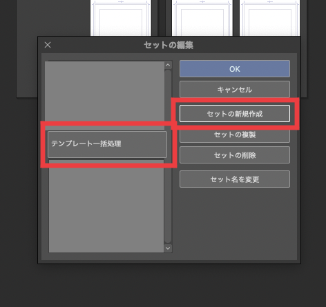 出てきたウインドウで セットの新規作成→一括処理に使うものだということがわかりやすいセット名を付けます。
