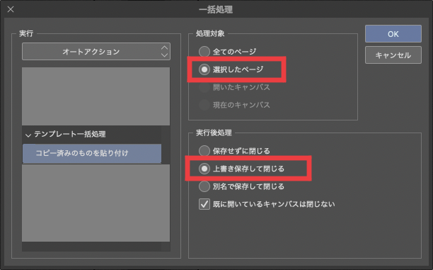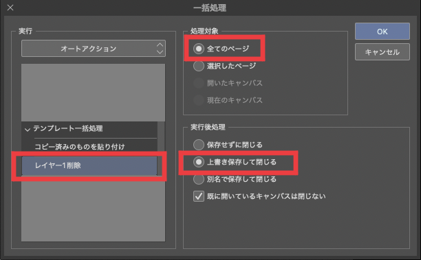 削除のオートアクションを選択して、処理対象は全てのページにします。