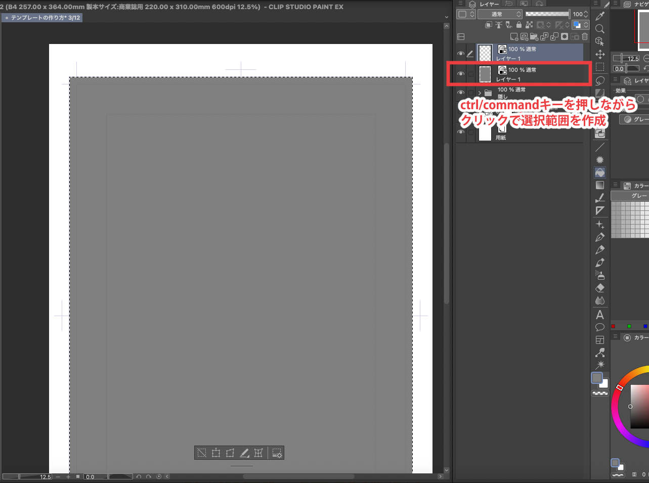 このとき、レイヤーパレットはテンプレートとして登録したいレイヤーのみの状態にしてください。いらないレイヤーがあるとそれもまとめて登録されていまします(「用紙」は消さずそのままでOK)