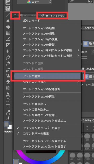 オートアクションパレットの左上にある三本線マークをクリック→セットの編集を選択します。