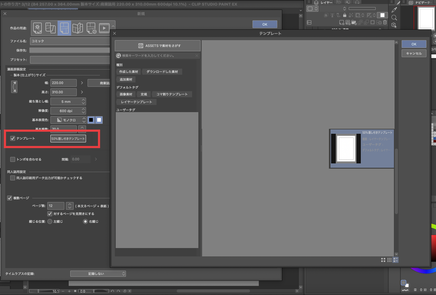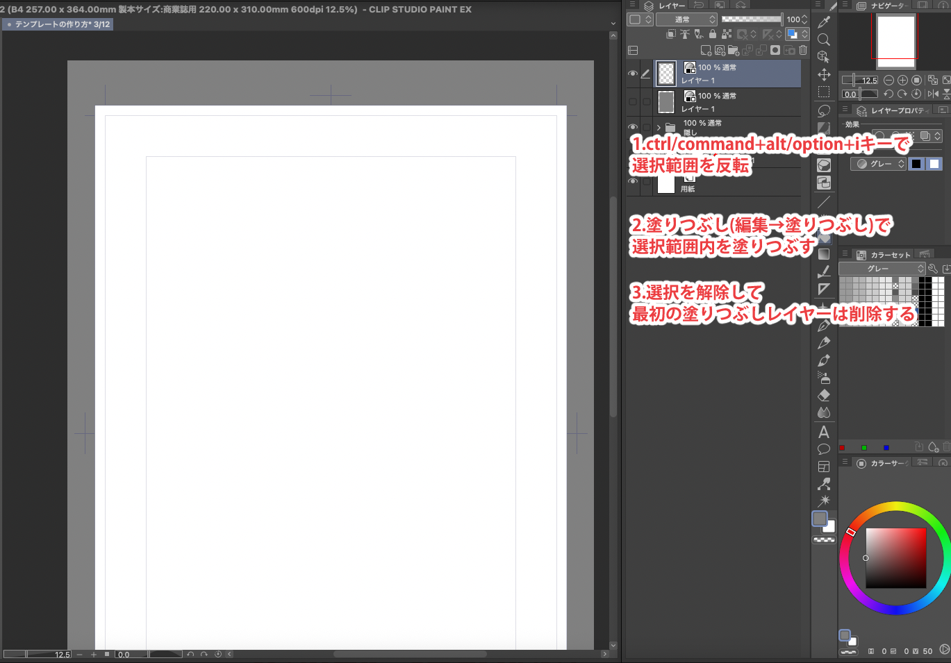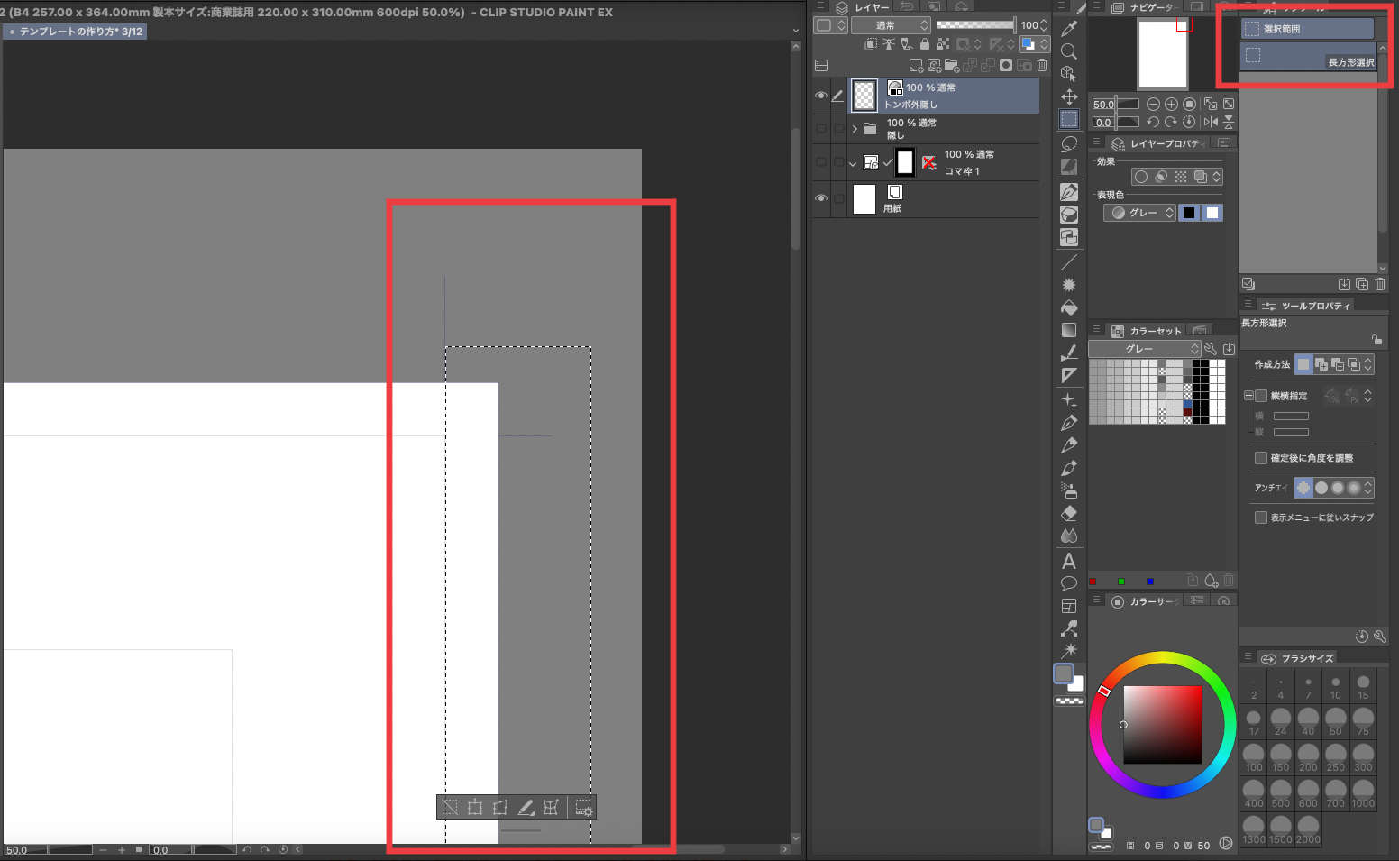 今回は漫画制作時にあると便利な「トンボ・外枠それぞれの外側を隠すレイヤー」を作る際のコツと、それをテンプレートとして実際の原稿に入れていく方法を記載します。