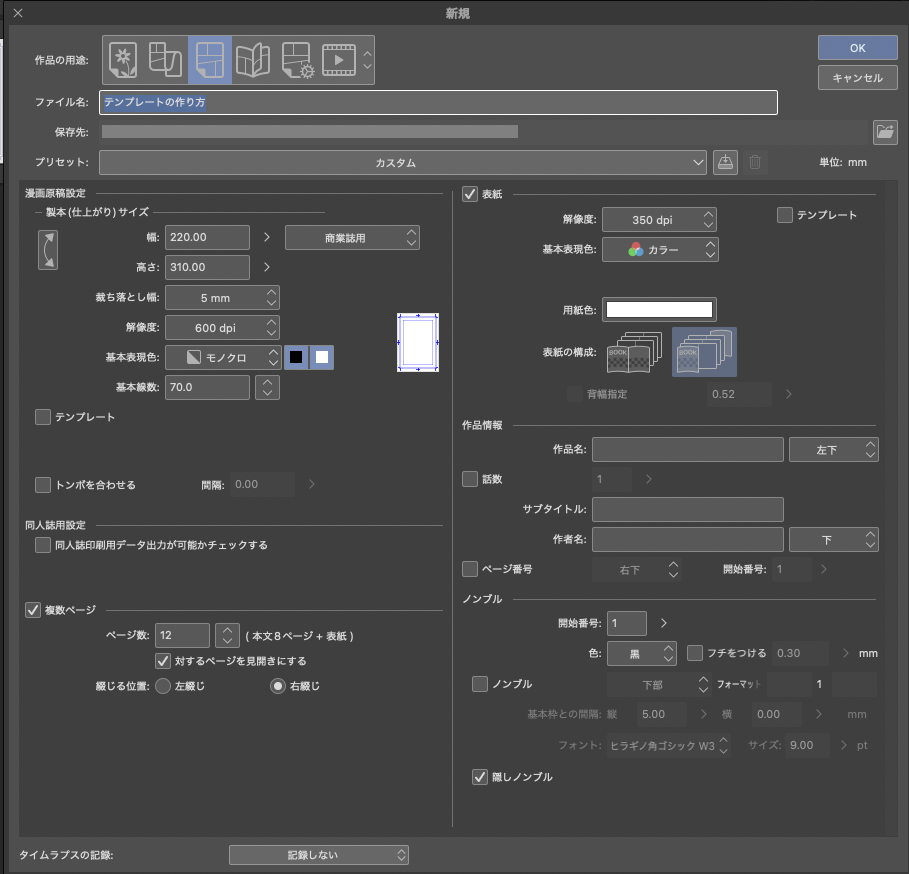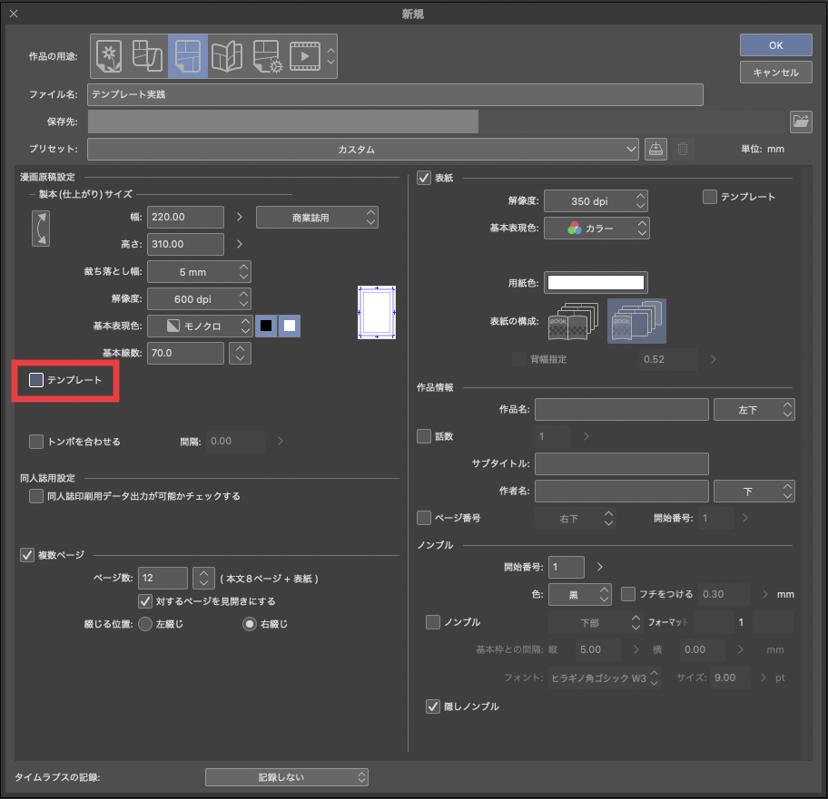 今度はテンプレートのチェックを外して原稿データを作成します。