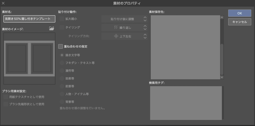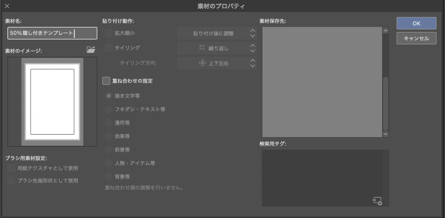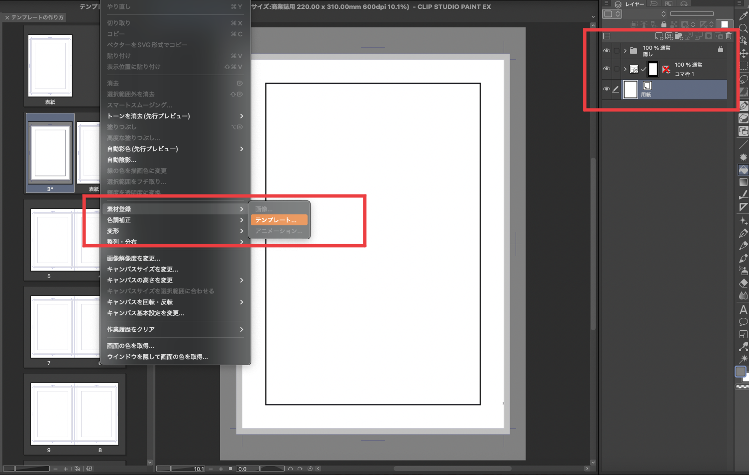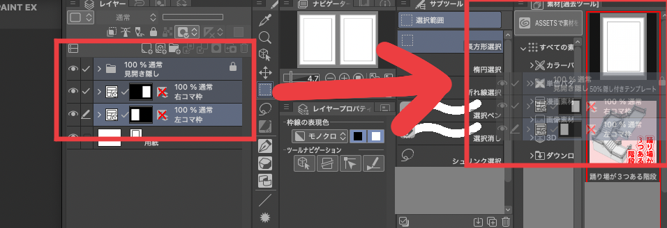隠しフォルダとコマ枠レイヤー2枚だけを選択したら、今度は素材パレットにドラッグ&ドロップで登録します。