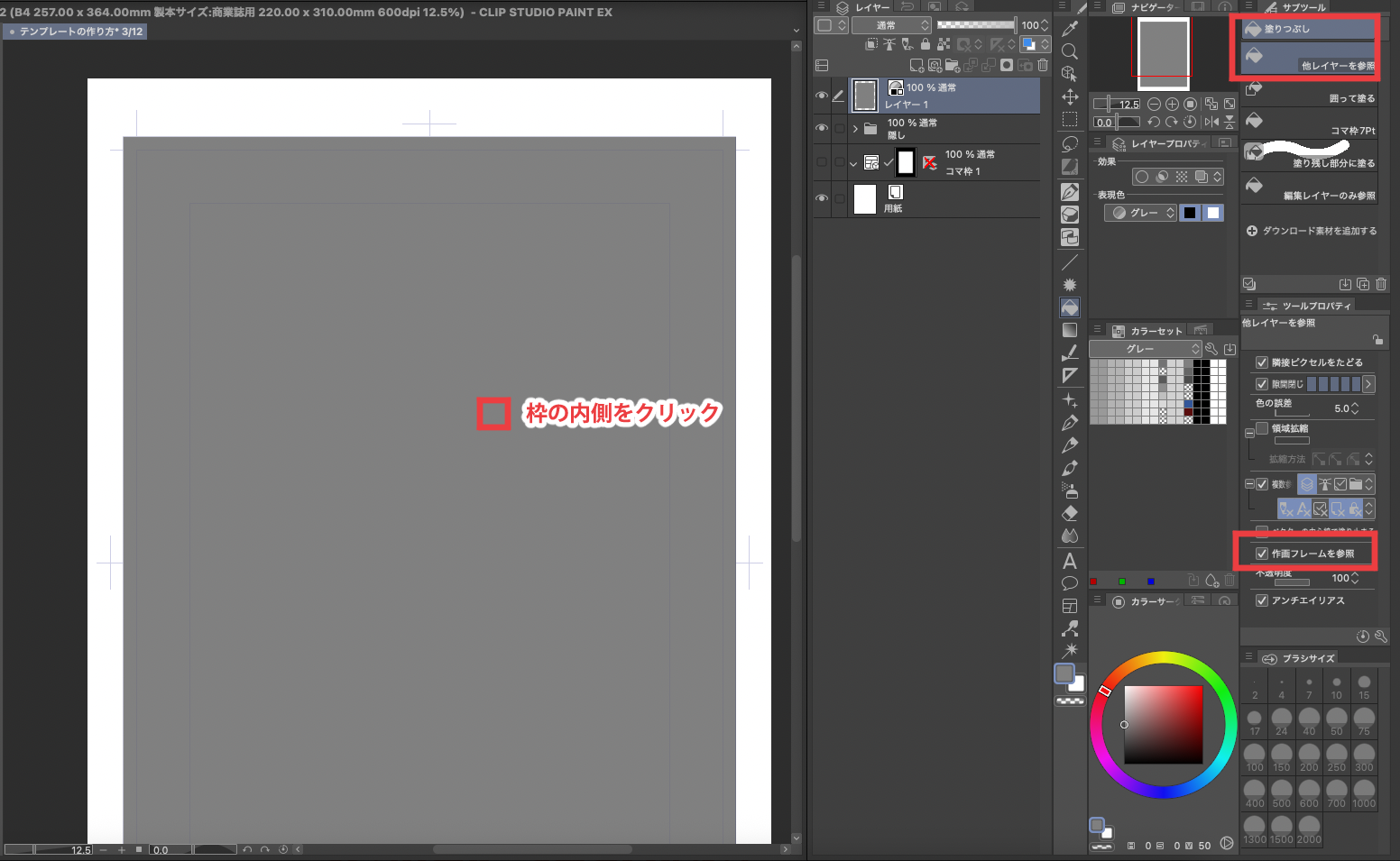 続いて「塗りつぶし」ツールで「作画フレームを参照」にチェックを入れて枠の内側をクリックすると、塗り足しまで含む範囲が塗りつぶされます。