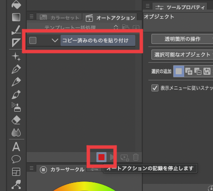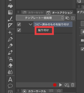 オートアクションパレット下部の●ボタンを押すと記録が開始されるので、そのままペーストを実行したら■ボタンを押して記録を停止します。