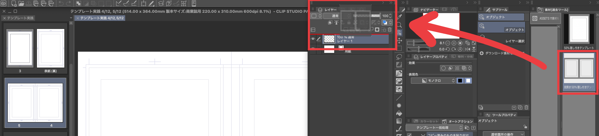 見開きの4-5ページを開き、見開きのテンプレートをレイヤーパレットにドラッグ&ドロップします。