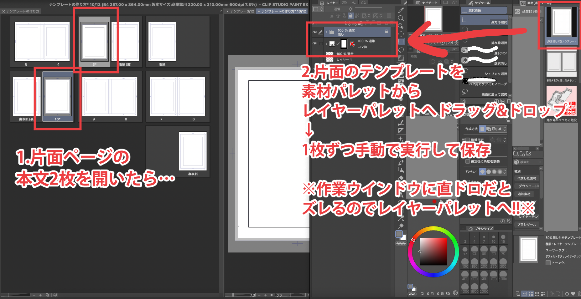 原稿データができたら、片面ページの2枚を開いてそれぞれにテンプレートを貼り付けます。