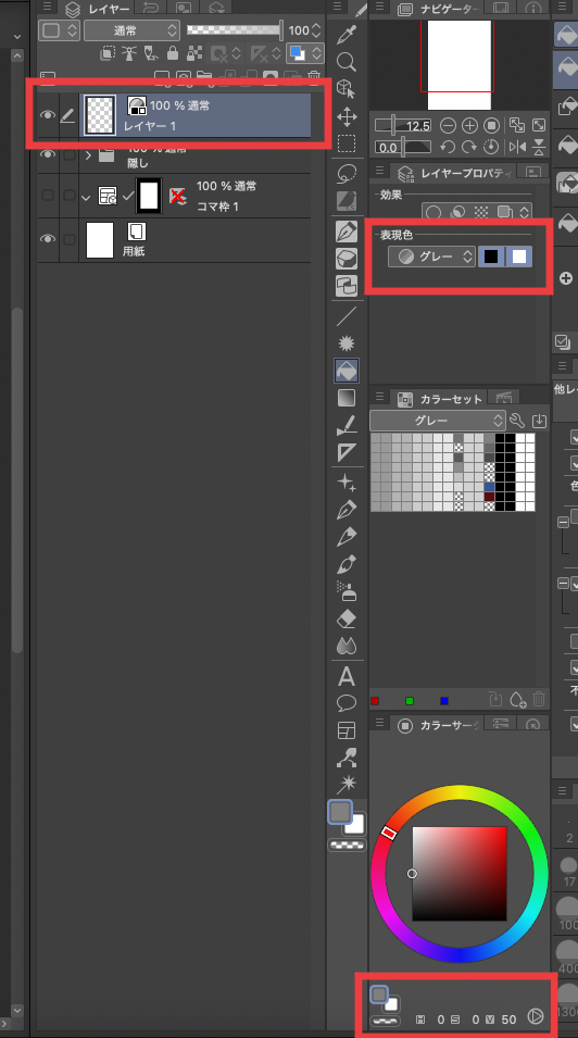 新規のグレーレイヤーを作り、描画色を50%グレーにします。